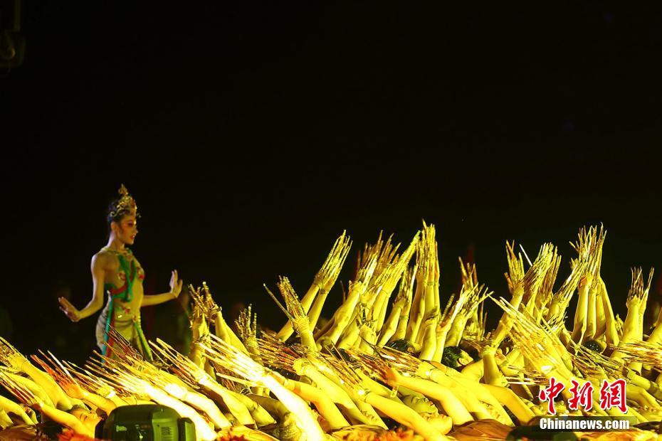 7月24日晚,大型喷泉音乐秀“梦幻·千手观音”在山西省晋中市榆次区潇河莲花湾上演,揭开了中国·潇河文艺小镇建设序幕。来自中国多地的艺术家汇聚于此,用音乐、舞蹈、水秀、灯光艺术等为当地民众上演了一场别样的视觉盛宴。图为“千手观音”舞蹈与水秀同台上演。张云 摄