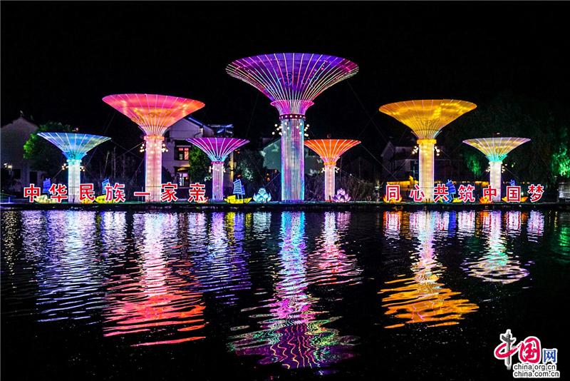水乡周庄灯区以江南水乡格局为依托,重点打造“水乡夜色美—周庄古镇”“两岸一家亲—台湾老街”和“欢乐田园嗨—香村祁庄”三大主题片区,130多个灯组点亮周庄绚烂多彩的夜晚。