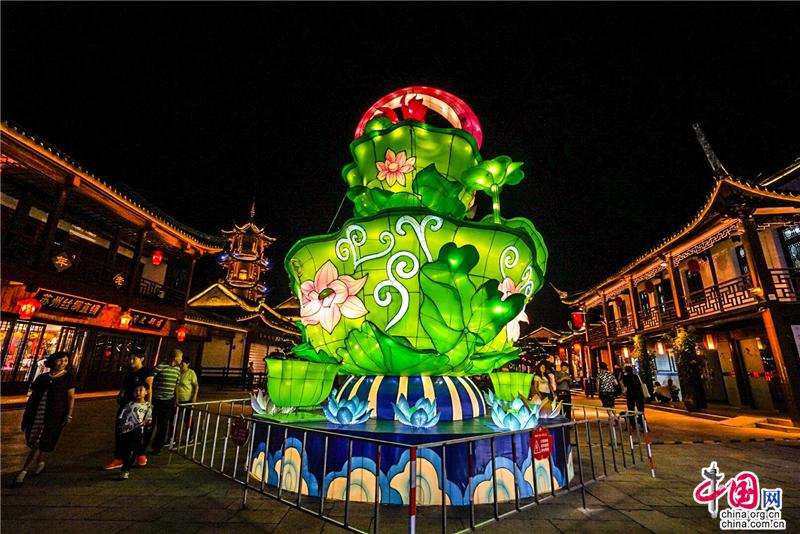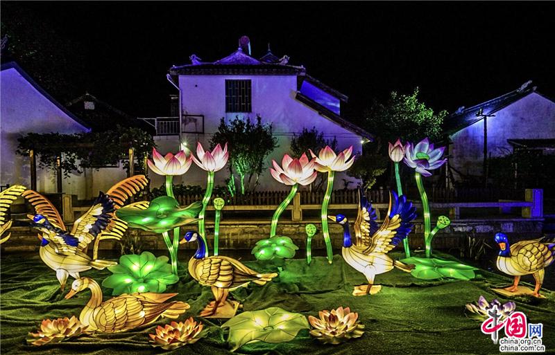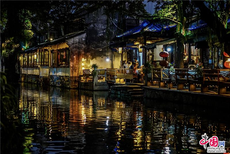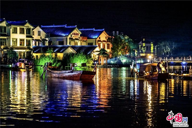 适逢中秋佳节,周庄古镇的夜晚璀璨绽放,已经有了浓浓的节日氛围,游人流连月下灯前,映照着一副副喜悦的脸庞,漂亮的女孩们穿上古装提着灯笼应景;一艘艘乌篷船穿梭于流光之中,船娘幸福的歌声悠悠荡漾。