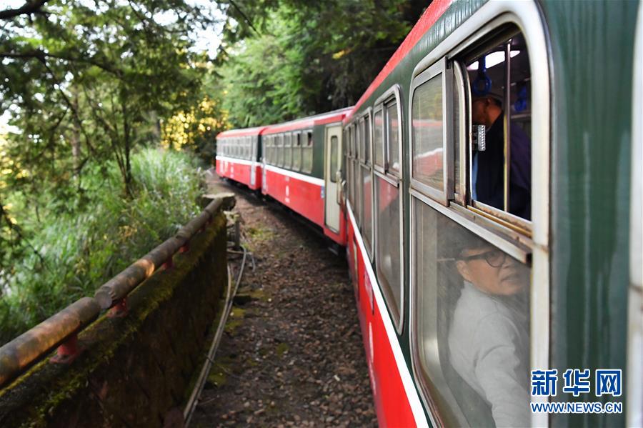 10月7日,一列小火车行驶在阿里山林区。新华社记者 陈斌 摄