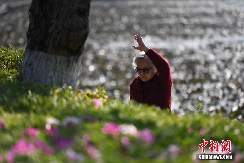 3月20日,一名老人在公园内运动。当日,昆明市区翠湖公园迎来开放后的第三天。疫情期间,公园内禁止一切群体性活动,游客需扫码、测量体温入园。 中新社记者 康平 摄