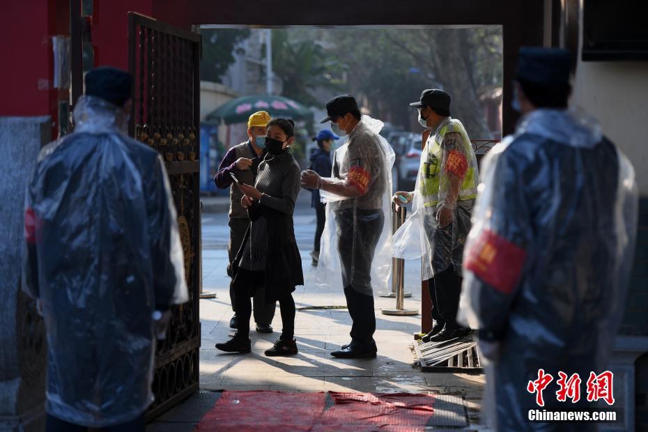 3月20日,工作人员在景区入口对游客进行体温测量和信息登记。当日,昆明市区翠湖公园迎来开放后的第三天。疫情期间,公园内禁止一切群体性活动,游客需扫码、测量体温入园。 中新社记者 康平 摄