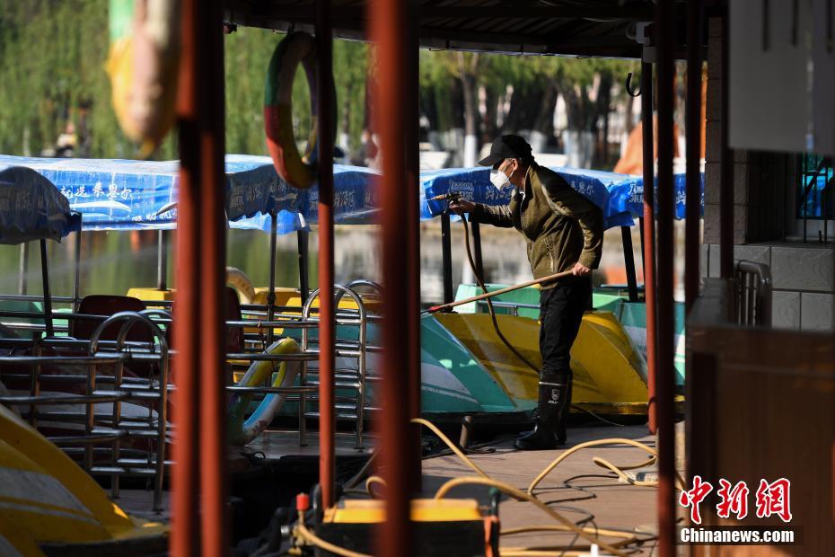3月20日,景区工作人员清洗供游客乘坐的游船。当日,昆明市区翠湖公园迎来开放后的第三天。疫情期间,公园内禁止一切群体性活动,游客需扫码、测量体温入园。 中新社记者 康平 摄