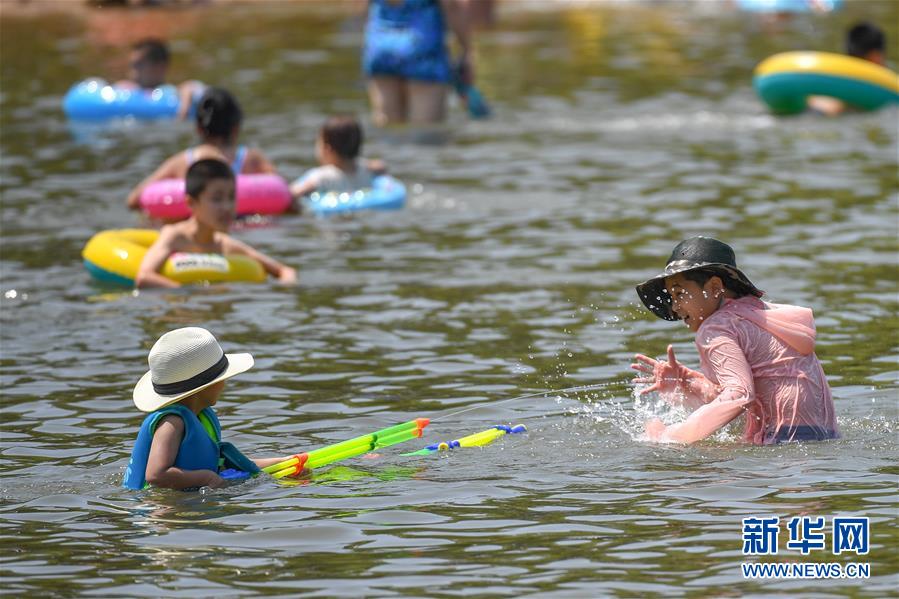 7月16日,小朋友在长春南湖公园沙滩浴场戏水。 当日是“头伏”首日,吉林长春最高气温达33℃,众多市民来到南湖公园乘凉避暑。 新华社记者 张楠 摄