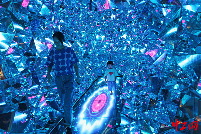 2020年9月6日,上海,位于南京路的网红打卡地独角兽星空艺术馆升级了浪漫神奇的镜像视效空间,展馆有浩瀚星河、明灯三千等20余个梦幻场景,运用镜面装置结合光影特效,打造出360度沉浸式体验,除了吸引各路网红主播拍照直播外,还有不少父母带孩子来“太空遨游”。图片作者:陈玉宇/视觉中国