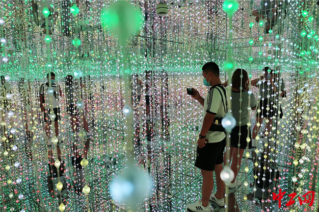 2020年9月6日,上海,位于南京路的网红打卡地独角兽星空艺术馆升级了浪漫神奇的镜像视效空间,展馆有浩瀚星河、明灯三千等20余个梦幻场景,运用镜面装置结合光影特效,打造出360度沉浸式体验,除了吸引各路网红主播拍照直播外,还有不少父母带孩子来“太空遨游”。图片作者:陈玉宇/视觉中国
