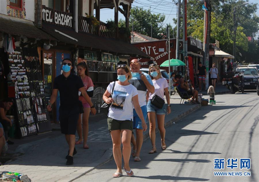 9月7日,游客在罗马尼亚黑海海滨度假地旧瓦马的商业街上行走。 旧瓦马是罗马尼亚著名的海滨度假地。受疫情影响,今年夏季游客大幅减少。 新华社发(彼得雷斯库摄)