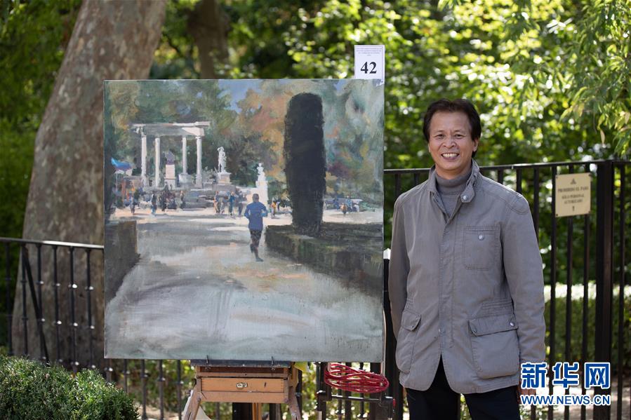 10月17日,在西班牙马德里卡普里乔公园,中国画家饶金中与自己的作品合影。他的作品荣获比赛一等奖。 西班牙第十六届“秋日卡普里乔公园全国油画写生比赛”17日在马德里举行。 卡普里乔公园坐落在马德里东北部,建于十八世纪末到十九世纪上半叶,是马德里现存唯一一个浪漫主义时期的公园,被认为是马德里最美公园之一。 新华社记者 孟鼎博 摄