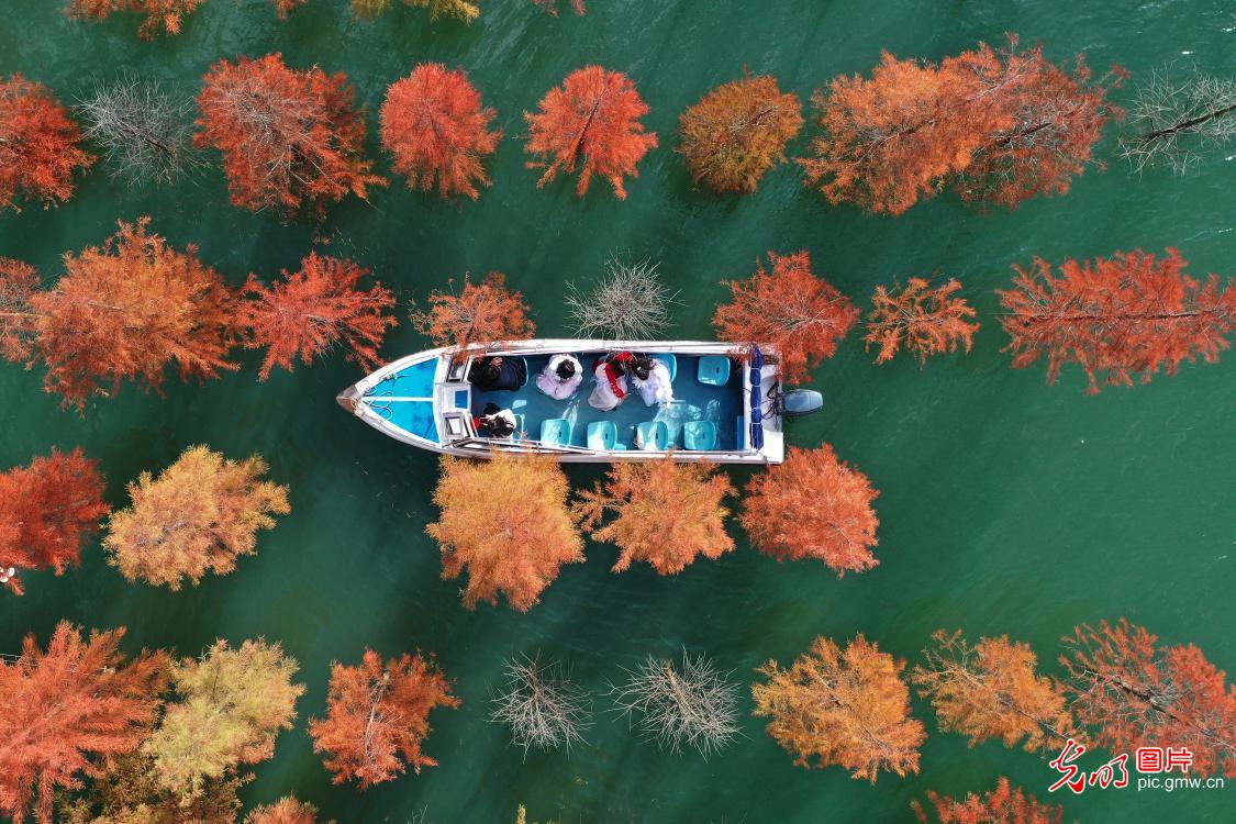 2020年11月2日,游客在湖北省荆门市漳河水库水杉林坐船游玩。连日来,漳河水库的水杉林迎来最佳观赏期,红色的枝叶与碧绿的漳河水交相辉映,犹如一幅美丽画卷,吸引不少游客前来游玩。(彭琦摄/光明图片)