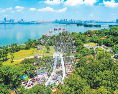 武汉东湖磨山景区欢乐丛林“东湖之眼”摩天轮于8月18日正式运营。“东湖之眼”摩天轮直径49.9米,最高点离地面近55米。摩天轮28个座舱采用“樱花粉”色系,可同时容纳112人乘坐。