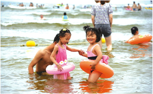 7月9日,游客在日照海边游玩。时下正值暑期,海滨城市日照吸引了不少游客前来消夏避暑。