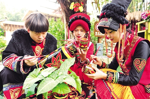 上图:在第十四届文博会锦绣中华分会场上,非遗传承人在展示彝族漆画制作技艺。韦 旋摄