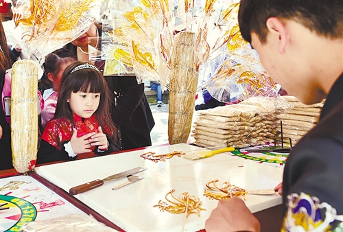 上图:非遗传承人在展示传统的中国糖画技艺。韦 旋摄