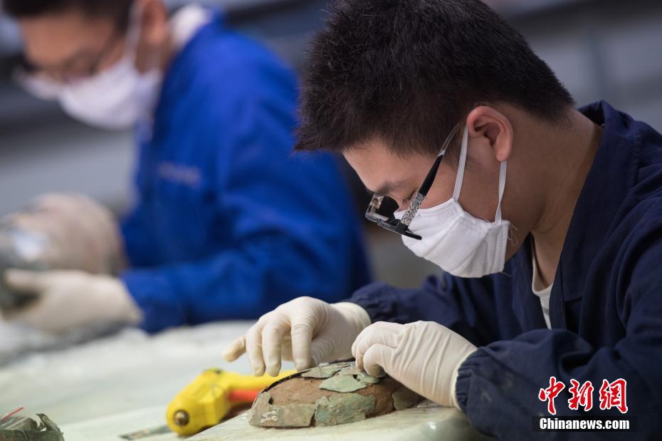 5月14日,国际博物馆日前夕,在位于太原市的山西博物院文物保护中心,50余名文物修复师分别对大量的古代壁画、青铜器、书画进行精心修复,工作量繁重。中新社记者 韦亮 摄