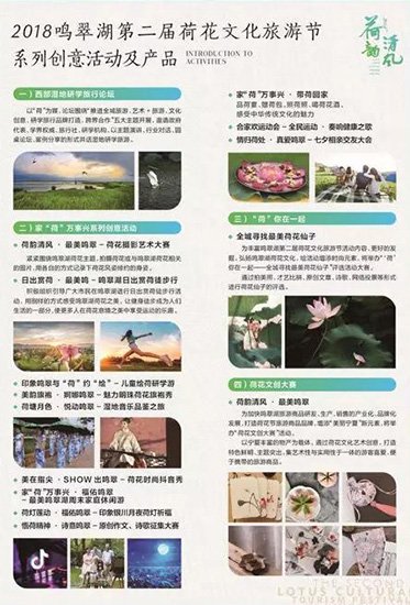 近年来,鸣翠湖国家湿地公园充分发挥生态湿地品牌优势,通过举办荷花文化旅游节,以节庆促旅游、促开放、促发展,推动“文化+旅游”创新发展。同时,着力打造“荷花节”旅游文化名片,充分挖掘鸣翠湖的荷花文化、湿地文化及生态文化,全面提升鸣翠湖荷花节在全区以及全国的知名度和美誉度。今年,第二届鸣翠湖荷花节在第一届荷花节的基础上,增加荷花文化内涵,丰富文化活动内容,以湿地研学打造文化鸣翠,阖家欢乐筑建温情鸣翠,摄影绘画记录印象鸣翠,旗袍佳人塑造婀娜鸣翠,音乐时尚秀出悦动鸣翠,七夕交友构筑真爱鸣翠,诗歌作文抒写诗意鸣翠,荷花仙子传播美丽鸣翠,力争将鸣翠湖荷花节打造成为全国知名“文化旅游交流盛会、合作共赢完美平台”。