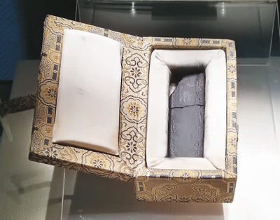 位于博物馆二层的展厅里,一方已分为两段的墨石静静躺在盒中,上面的“文府”二字清晰可见,这就是距今已有千年历史的宋代“文府墨”,也是博物馆的“镇馆之宝”。“文府墨为北宋时期制作,1978年出土时,已在水中浸泡多年而不损,十分罕见。”博物馆讲解员张莉婷说。