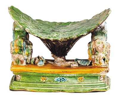 在第一展厅《走进徽州》里,展出的是徽州地区出土的青铜器、瓷器等艺术精品,其中一件明代的法华三彩荷叶形瓷枕造型格外别致、生动。瓷枕分两部分,上部呈荷叶状,底座长方形,荷叶由两山石支撑,间以荷花装饰。胎体厚重,有裂纹,通体施黄绿紫釉法华三彩,具有很高的艺术价值。而另一件狮形枕,通体施青白釉,枕上釉面斑驳,枕面下呈卧狮形,神态可掬,妙趣横生。博物馆中,还有不少越国的青铜器,距今已有2000多年历史。
