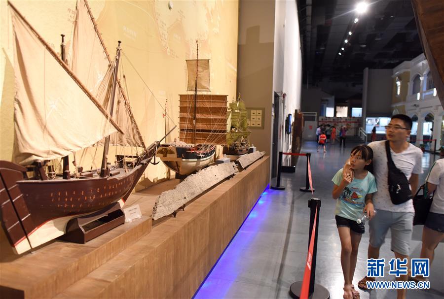 7月25日,一名小朋友和家长在广东省博物馆的广东历史文化展厅内参观。暑假期间,不少孩子来到广东省博物馆,通过参观文物,学习广东地方历史、民俗文化,丰富暑期生活。新华社记者 卢汉欣 摄