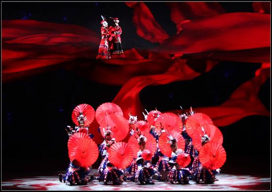 比如在展现族人迁徙的过程中,通过人屏互动,演绎出逼真的四季变换、山体滑坡的震撼场面,表现出迁徙队伍穿过苍凉大地、布满荆棘的丛林,在渡过恶浪滔天的黄河时不幸遗失了稻种。在到达方尤后,有一幕梦幻般的河边沐浴场面,运用威压和杂技,一个女子坐在月亮里从天而降,浅吟低唱。姑娘们和小伙子们在空中飞荡,追逐嬉戏,场面唯美动人。在娜悠和岜尤寻找稻种的路上,适时响起的男女二重唱,配合台前水幕变化以及绸吊舞蹈,歌声动人,画面凄美,十分感人。