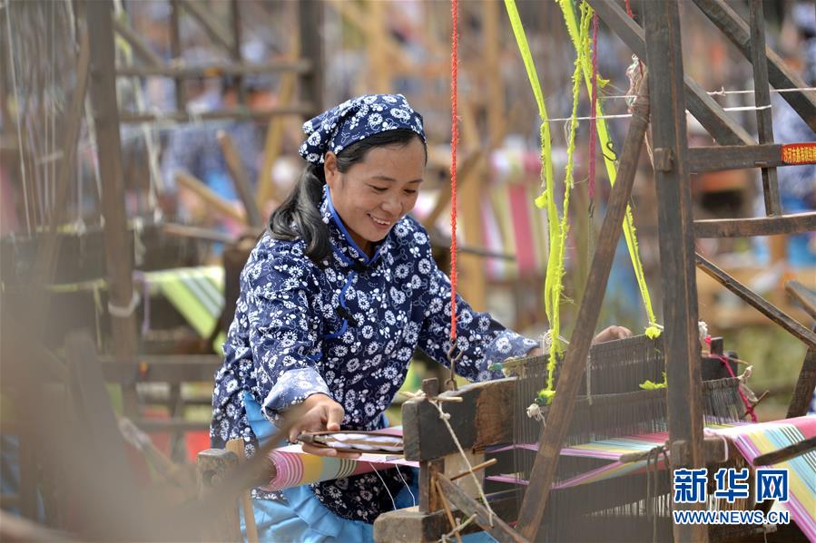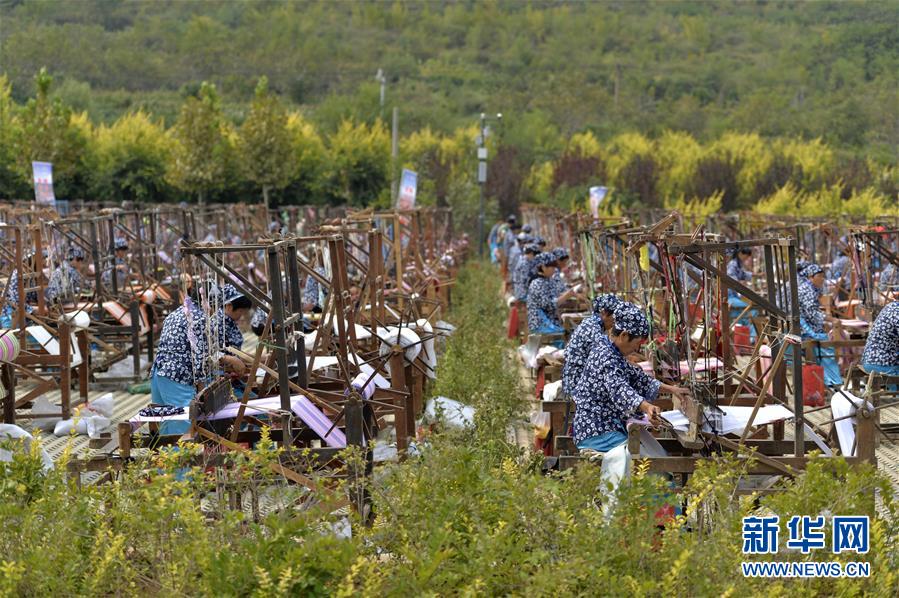 9月12日,织女在展示沙河四匹缯布制作技艺。 当日,河北省沙河市塔子峪村及周边村庄的801名织女同时飞梭织布,展示河北省级“非遗”项目——沙河四匹缯布制作技艺。据了解,沙河四匹缯布是一种广泛流行于沙河西部山区、丘陵等地的民间织造土布,因其在织造过程中使用四匹缯来分辨经线的格式,故称四匹缯。 新华社记者牟宇摄