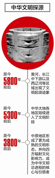 研究表明,距今5800年前后,黄河、长江中下游以及西辽河等区域出现了文明起源迹象,而距今5300年前后,中华大地各地区陆续进入了文明阶段,距今3800年前后,中原地区形成了更为成熟的文明形态,并向四方辐射文化影响力,成为中华文明总进程的核心与引领者。