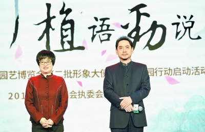 今天上午,北京世园会主题纪录片宣布正式杀青,保护生物学教授吕植(左)和影视表演艺术家刘劲作为北京世园会第二批形象大使与公众见面。本报记者 刘平摄 J163