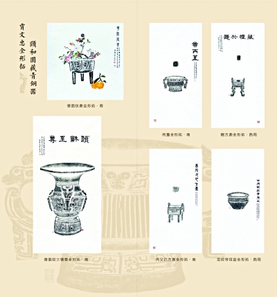 本次展览的亮点在于6件颐和园文物的全形拓作品亮相,包括商代兽面纹鼎全形拓、商代兽面纹三牺尊全形拓、商代丙簋全形拓、西周粣方鼎全形拓、商代丙父己方鼎全形拓、西周龙纹带耳盆全形拓。这六件文物都是颐和园文物中颇具代表性的青铜器,其中一级文物2件、二级文物4件。特别是商代兽面纹三牺尊,堪称颐和园的“镇园之宝”。