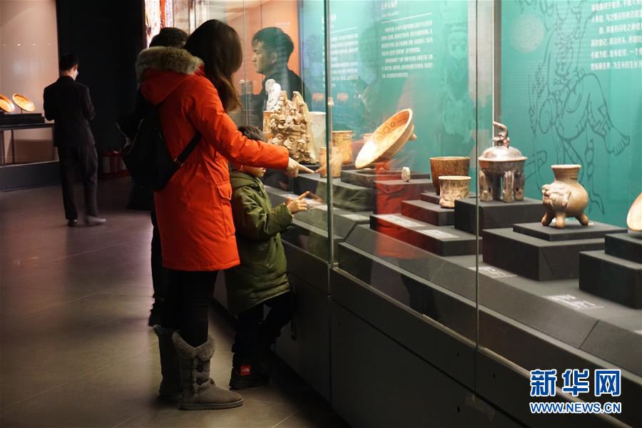 1月1日,观众在金沙遗址博物馆里参观跨文明特展展品。 新华社记者康锦谦摄