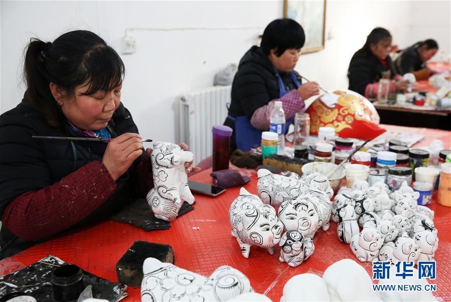 1月7日,陕西省宝鸡市凤翔县城关镇六营村手工艺人制作猪年泥塑作品。 春节临近,人们忙着制作节庆用品、手工艺品等,喜迎新春佳节。 新华社发(赵钊 摄)