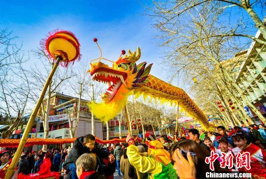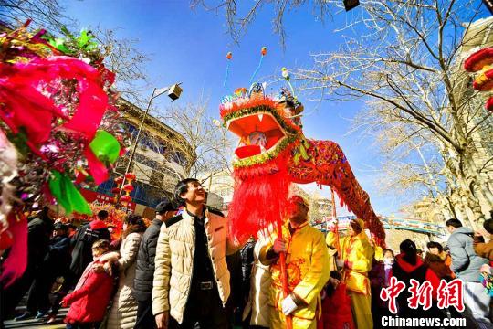 2月10日,在敦煌街头进行的社火舞龙表演。 王斌银 摄