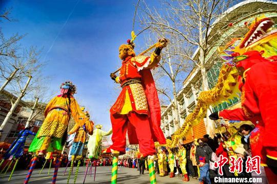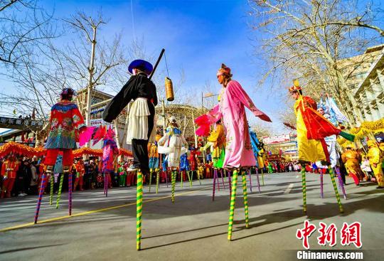 2月10日,在敦煌街头进行的社火踩高跷表演。 王斌银 摄