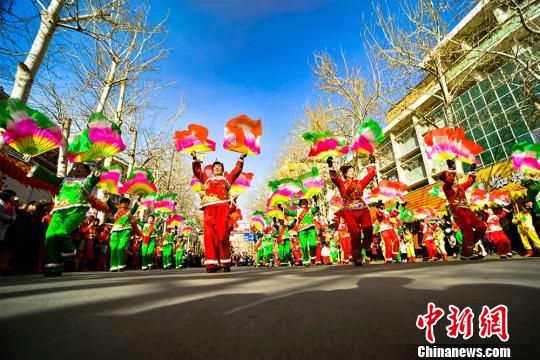 2月10日,在敦煌街头进行的社火扭秧歌表演。 王斌银 摄