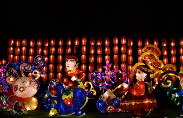 在北京丰台南宫旅游景区,120多组5000多盏手工打造的非遗花灯集中亮相,龙凤主题灯组在夜空中营造吉祥气氛;造型各异、憨态可掬的开心五福猪等花灯一字排开,向游客恭贺新春。