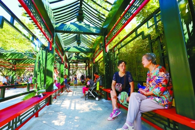 居民在富含古典园林风格的什刹海东福寿里口袋公园内消闲纳凉。本报记者 方非摄