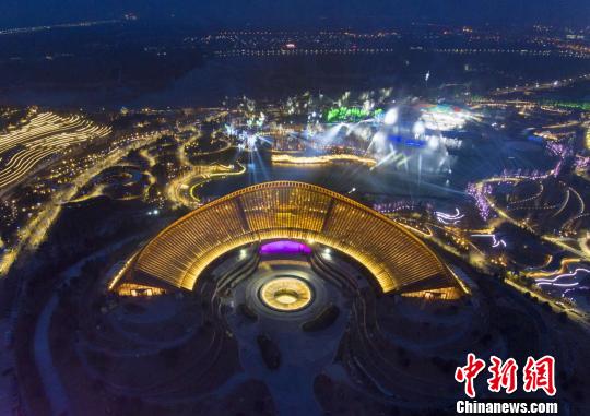 北京世园会将于4月底盛大启幕。图为园区内面积最大的场馆国际馆的夜景图,94把“花伞”搭配灯光照明,可呈现一片五彩斑斓之景。北京世园局供图