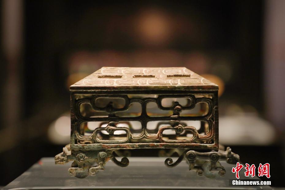 4月3日,“清明祭初祖 文脉传华夏”网络主题采访团走进梁带村芮国遗址博物馆。梁带村芮国遗址博物馆于2018年2月14日正式对外开放。梁带村芮国遗址位于陕西省韩城市西庄镇,为西周、东周时期古芮国遗址,发现于2004年10月。图为在芮国遗址博物馆展出的镂空方盒,博物馆主体建筑风格就是对该文物进行提炼而设计。赵昊 摄