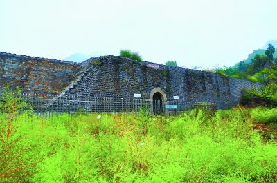 在城墙上行走,忽看到内侧城墙上有七八个半圆形凹槽,这在别处城墙上很少见。当地人说,凹槽是流雨水的。不过也有资料记载,这是运送物品的滑道。如今城楼消失,水关不再,河道变为公路,关口却依然壮丽。笔者想到了那块巨石,想看看上面的字迹,但城楼上围起铁栏,天雨路滑,无法绕到近前。券门南有一农家院落,蹚着没腿的草来到门前,铁将军把门,无缘看到石之南侧,白白打湿了半截裤子,只能作罢。