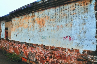 老街上有老房子,墙上的字吸引了笔者的目光。那不是通常多见的旧时标语,而是新中国成立后的法规条例原文,毛笔楷书,繁体竖排。墙上抹了白灰,白墙黑字,很是醒目。雨水冲淡了下半部字迹,能看到几百字,后面的白灰掉了,文字到此为止,不过能理解文字内容主要是如何惩治反动活动。这所房子的山墙已经开裂,可以看到上面有铁锔固定。