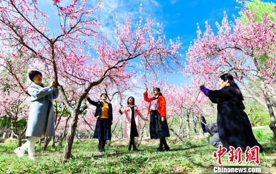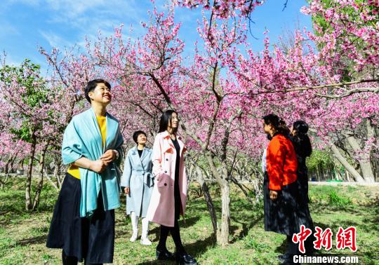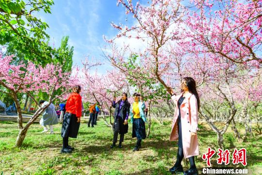 4月中旬,敦煌市民在敦煌城郊桃花园踏青、赏花。 王斌银 摄