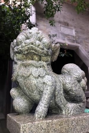 正厅前廊的小石狮,石狮口内有石珠,手可以深入狮口,石珠可以被拨动但无法取出,据说采用了镂空雕的技法。