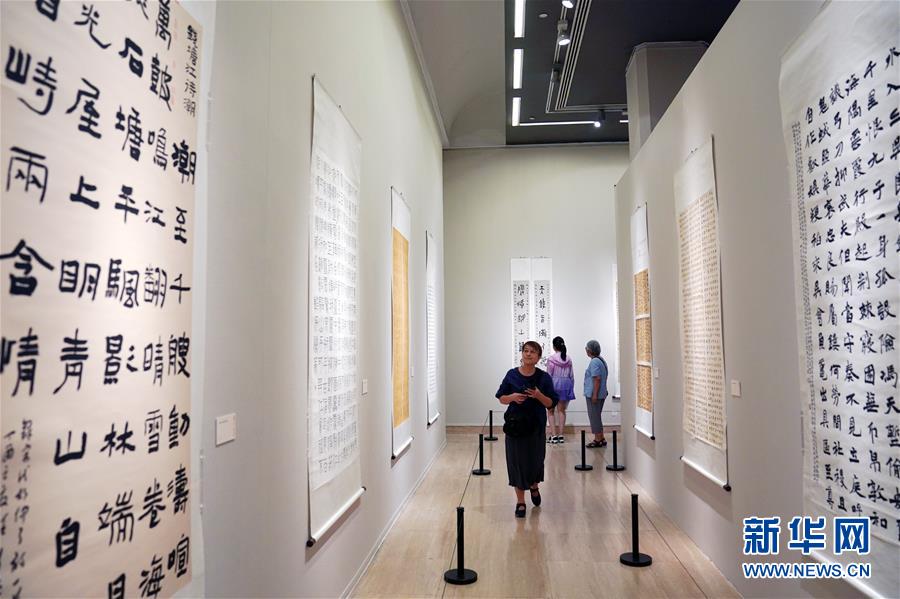 7月23日,参观者在中国美术馆欣赏展出的书法作品。 当日,“钱江弄潮——中国画、书法、篆刻艺术作品展”在北京中国美术馆开幕,共展出240多件各类作品,展示钱塘江文化在文脉整理研究、文艺创作展演、文化传承创新、文化事业和产业发展等方面取得的成果。 新华社记者 鞠焕宗 摄