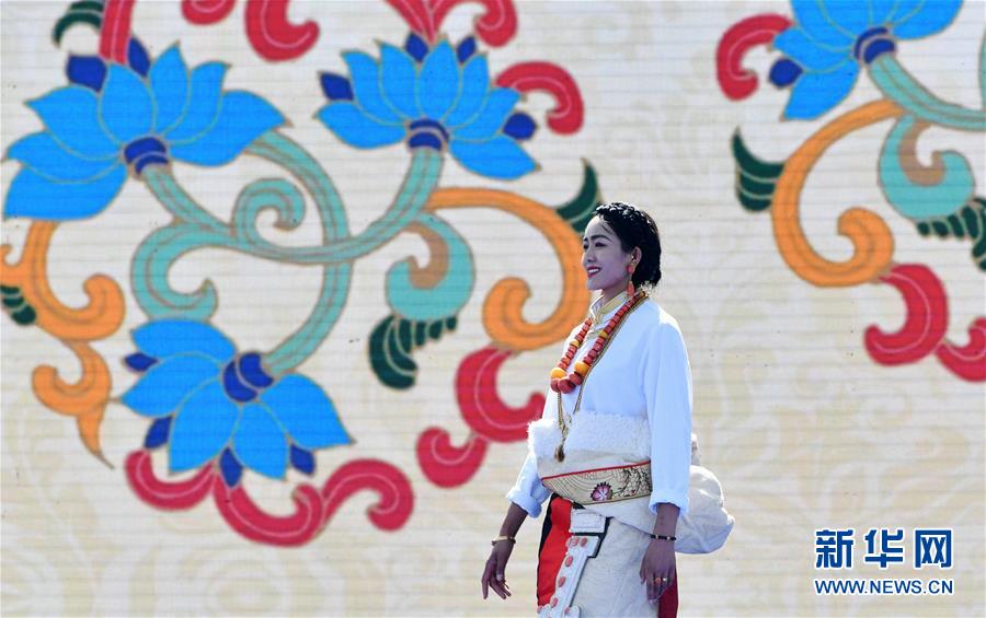 7月25日,演员在第七届中国·碌曲锅庄舞展演开幕式上展示藏族传统服饰。