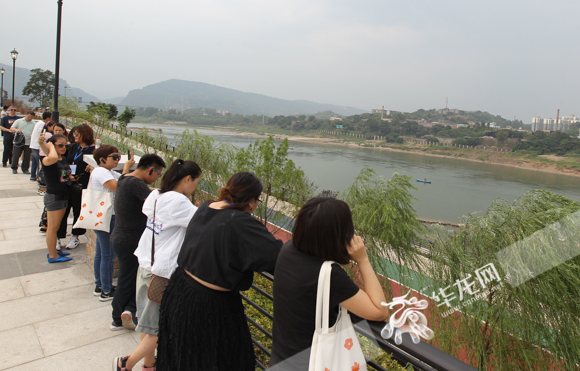 记者们在改建后的南京路片区休闲广场欣赏江景。华龙网-新重庆客户端记者 张质 摄