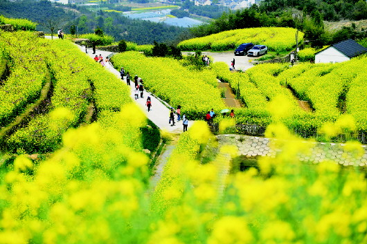 近期,随着疫情防控形势向好,景区开放,浙江省杭州市富阳区新登镇上旺村黑山顶的梯田上油菜花竞相开放(3月25日摄)。 新华社记者徐昱摄
