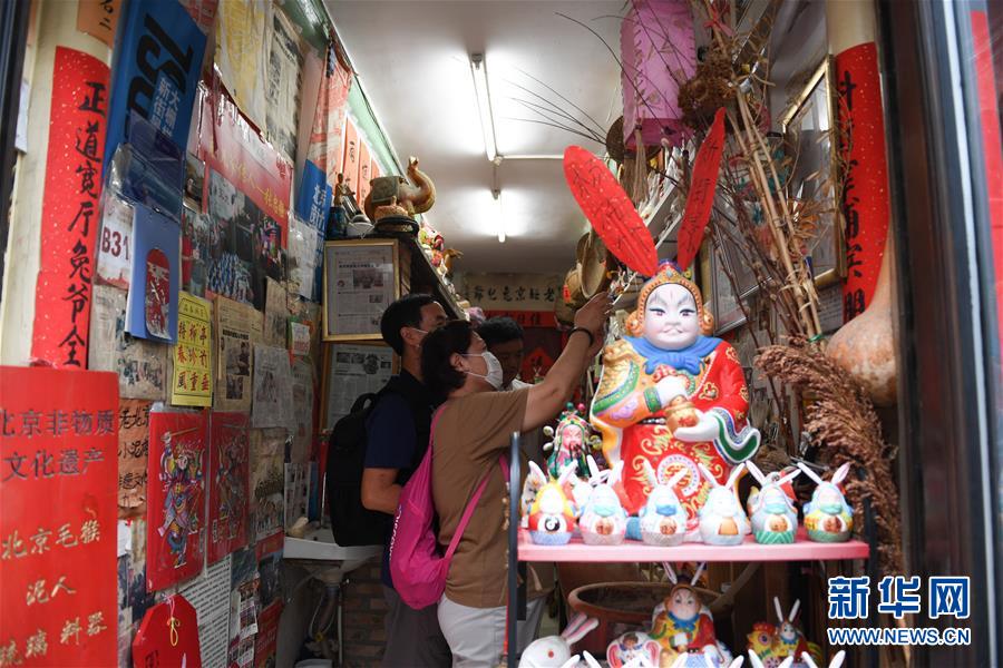 在北京杨梅竹斜街,游客在一家经营传统老北京手工艺品“兔儿爷”的小店参观(8月17日摄)。 新华社记者 鞠焕宗 摄