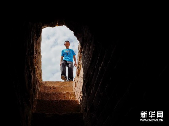 9月4日,李德旺从徐流口段长城一座敌楼顶部走下。新华社记者 牟宇 摄