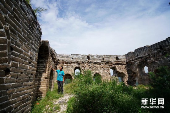9月4日,李德旺在徐流口段长城一座敌楼内查看墙体。新华社记者 牟宇 摄