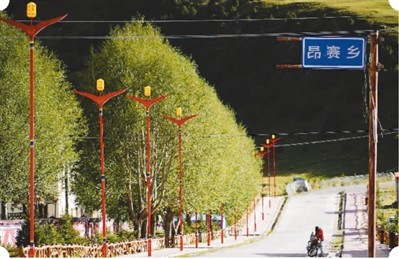 进入四面环山的昂赛乡,村口牌子上写有“不忘初心,牢记使命,守青护绿,生态报国”。街道两侧红色太阳能路杆、经幡旗、寺庙很是抢眼。安置的搬迁房整齐划一,笔直的马路延伸至山脚下,只见街道上有老人推着婴儿车、有遛弯散步的、有骑行的学生放学回家的……依藏族人的生活起居、风俗习惯和宗教信仰,该有的设施基本全具备。