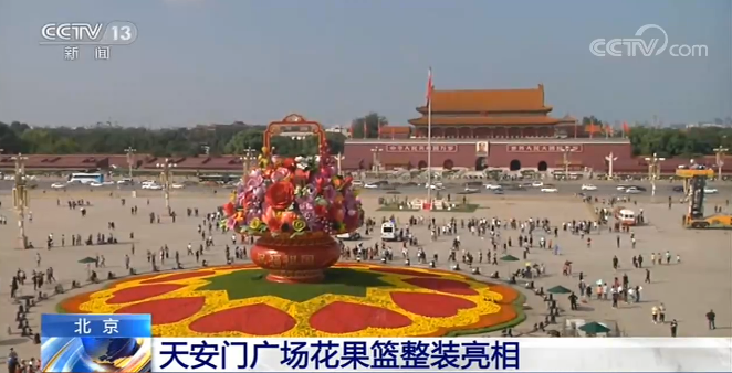 央视网消息:为了迎接国庆节,今年天安门广场中心布置“祝福祖国”巨型花果篮,长安街沿线还布置10处各具特色的主题花坛。今天(25日),天安门广场中心的花果篮正式亮相,长安街沿线的主题花坛也基本布置到位。