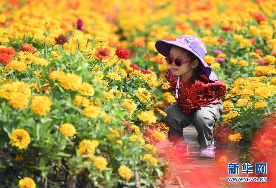 10月2日,一名小朋友在首农·紫谷伊甸园中赏花。 当日是国庆假期的第二天,一些市民和游客来到位于北京市丰台区的首农·紫谷伊甸园,享受假日时光。 新华社记者 任超 摄